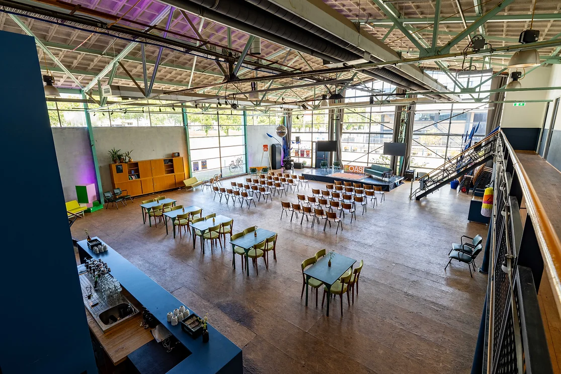 We zijn trots op onze nieuwe vergaderlocatie in de Vertrekhal Oranjelijn. Deze karakteristieke plek ligt in het levendige M4H-gebied (Merwe-Vierhavens), hét creatieve hart van Rotterdam, vol innovatie en duurzame initiatieven.
